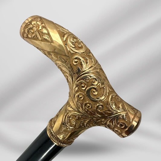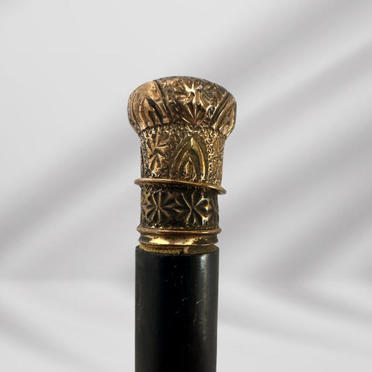 1800s Antique Luxury Gold-Plated Walking Stick for Men. Black Cane, Vintage Gentleman’s Accessory