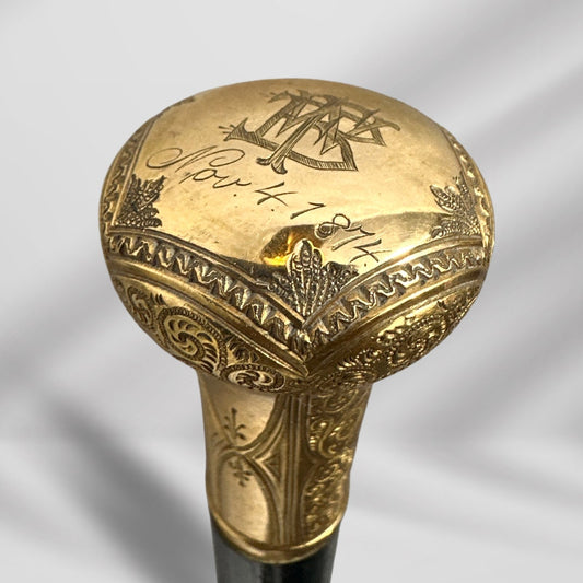 Antique 1860 Walking Stick. Black Cane with Carved Gold-Plated Knob Handle, Signed Skinner.
