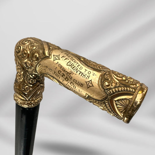 Gold-Plated L Handle Antique Walking Stick for Men. Signed Cane, Dated 1910