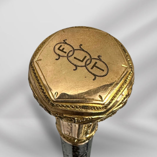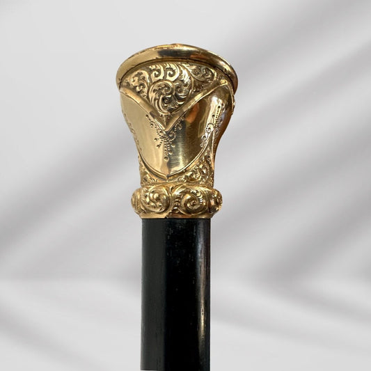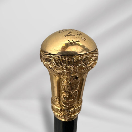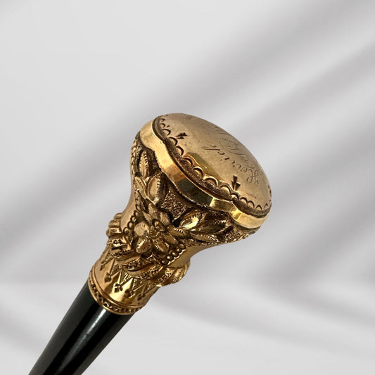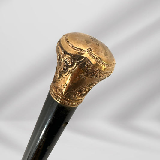 Antique Walking Stick. Elegant Black Cane with Gold-Plated Knob Handle, Signed Skinner Halifax.
