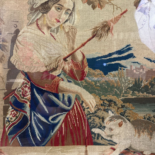 Antique Koblen Embroidery Artwork – Woman with Cat in Intricate Hand-Stitched Detail