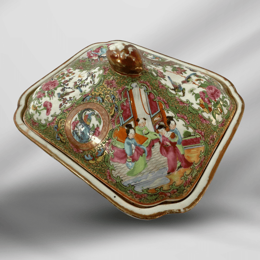 Antique Embossed Hand Painting Rose Medallion Chinese Porcelain Covered Dish Bowl