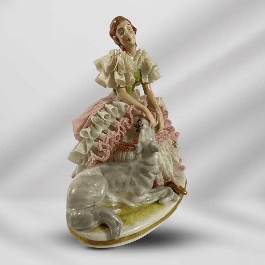 Vintage German Dresden Hand Painted Porcelain Statue Of Woman & Dog