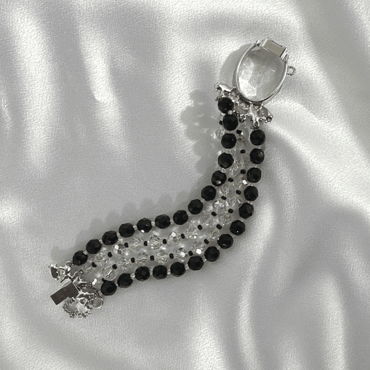 Vintage Black and White Lucite Beaded Bracelet with Clear Oval Crystal Accent