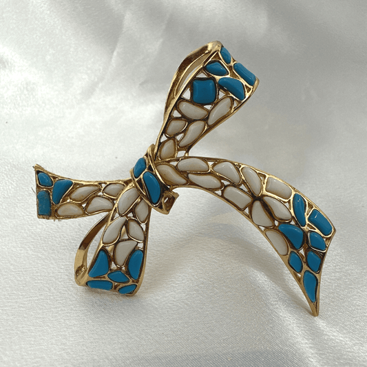 Signed Trifari Mosaic White and Blue Molded Glass Bow Ribbon Brooch Pin