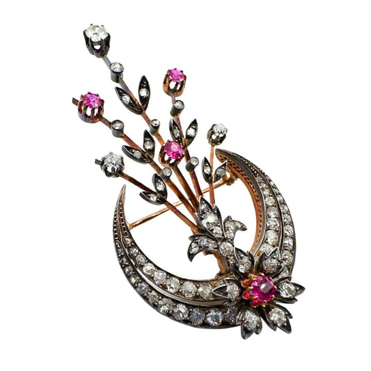 Antique French Diamond and Ruby Crescent Moon Brooch with Detachable Floral Spray, Circa 1860