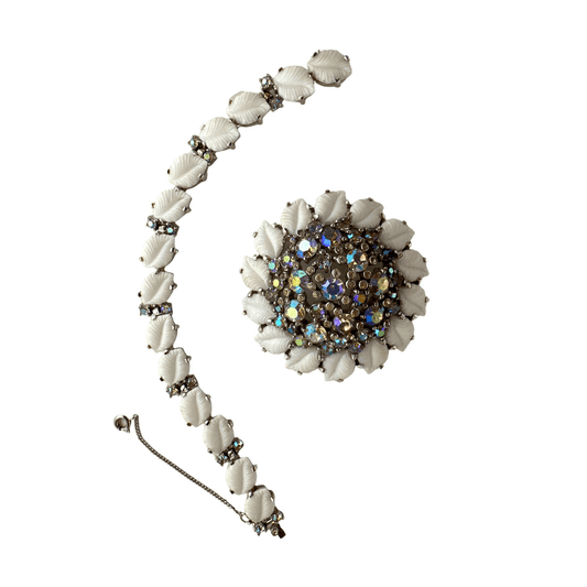 Signed Jomaz White Glass and Rhinestone Brooch and Bracelet Set