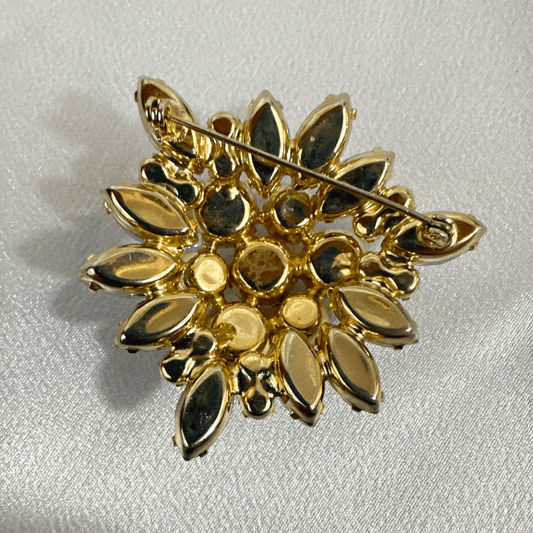 Georgian and Victorian brooches often feature symbolic motifs, portraiture, or hairwork. Art Nouveau brooches favor natural curves and feminine forms, while Art Deco examples use geometry, enamel, and diamonds. Mid-century brooches often lean into bold florals, figural designs, and bright rhinestones.
