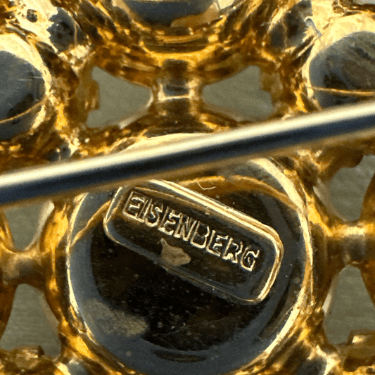 Vintage Eisenberg Brooch with Gem-Cut Stones, Green Rhinestones & Gold Accents
