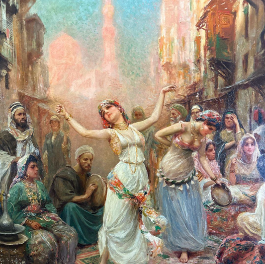 Fabbi’s paintings are filled with energy, color, and movement. He often depicted harem dancers, musicians, and lively court scenes adorned in flowing garments and set against elaborate architectural backdrops. His use of saturated color, swirling compositions, and expressive figures sets him apart as one of the most theatrical voices within the Orientalist movement. There is an unmistakable sense of joy and motion in much of his work.