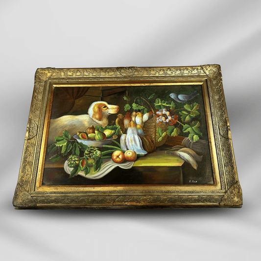 Vintage Gold Color Framed Still Life Dog Birds & Fruit Oil Painting On Wood