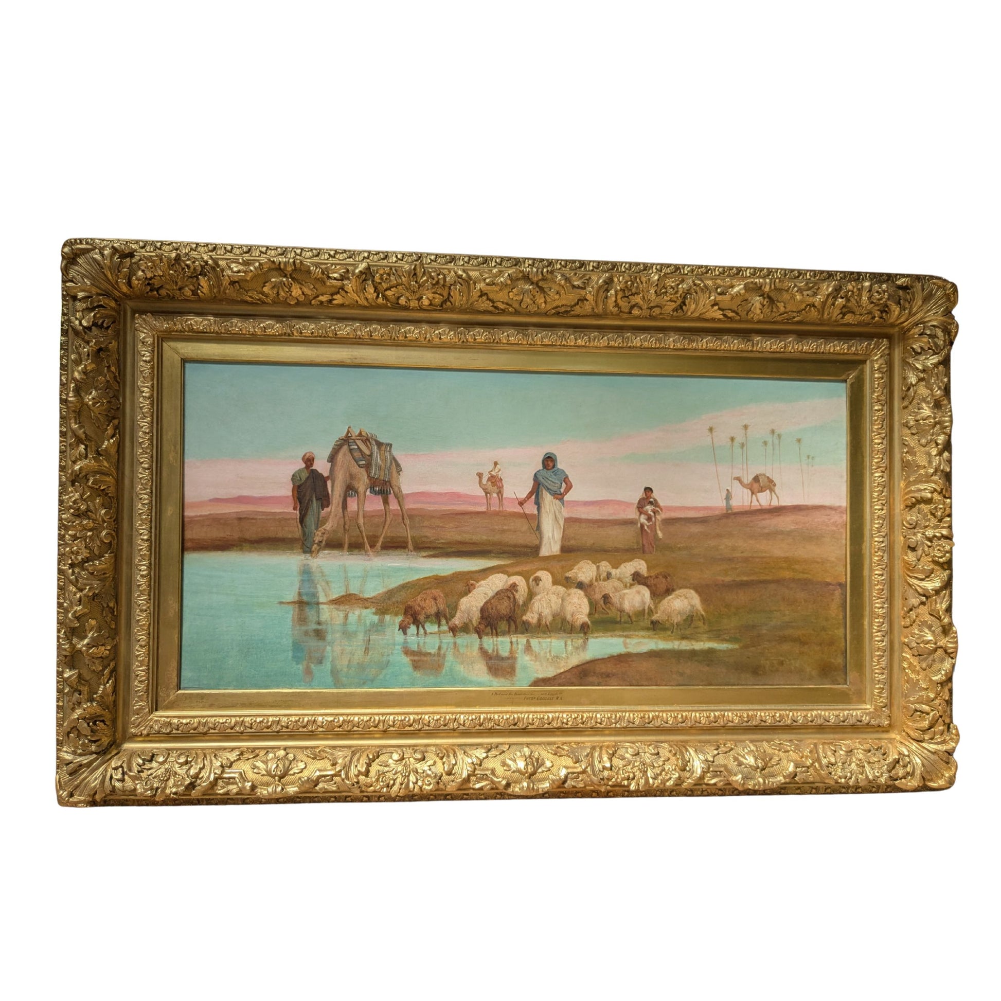 Frederick Goodall was one of the most prominent British Orientalist painters of the 19th century, exhibiting more than 170 works at the Royal Academy and earning widespread acclaim during his lifetime. A Pool at the Edge of the Desert reflects both his technical mastery and his nuanced approach to depicting the landscapes and people he encountered. This work offers not only a glimpse into a distant world but a rare opportunity to collect a painting by one of the era’s most respected artists.