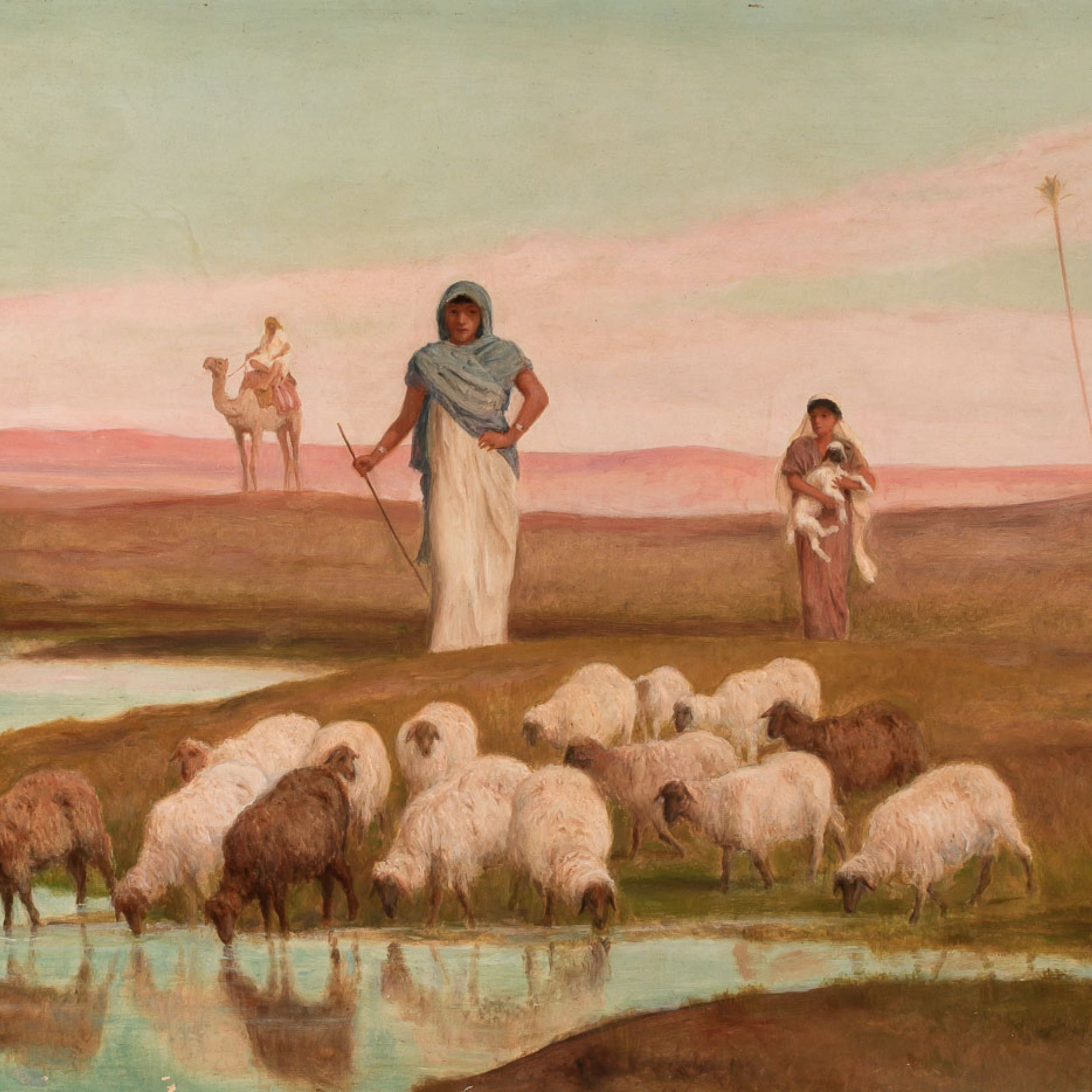 A tranquil moment rendered in rich detail, Frederick Goodall’s A Pool at the Edge of the Desert captures the serenity of pastoral life at the margins of arid wilderness. In this luminous desert landscape, a white-robed shepherdess stands watchfully beside a small watering hole as her flock drinks peacefully. Beside her, a second young girl cradles a lamb in her arms while two distant figures lead camels across the golden expanse. A pearlescent blue-green sky stretches over short grasses and sun-warmed earth, infusing the scene with a sense of quiet grace and timelessness.