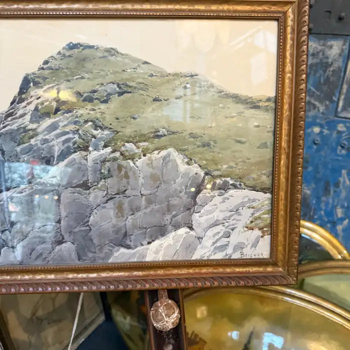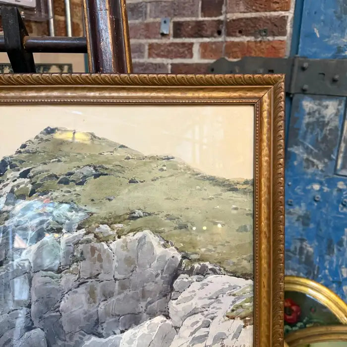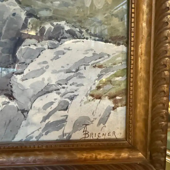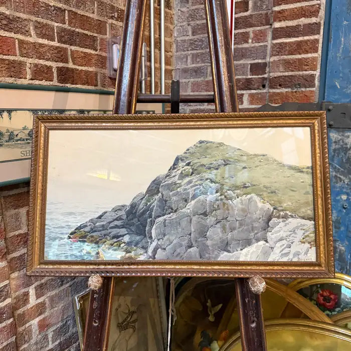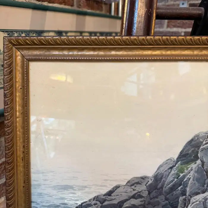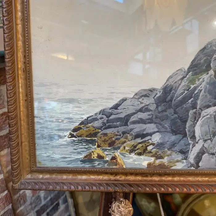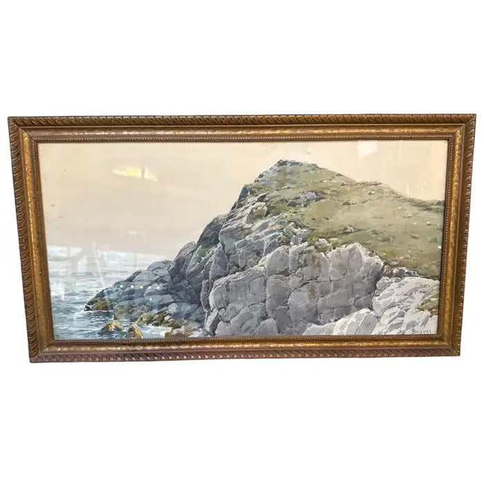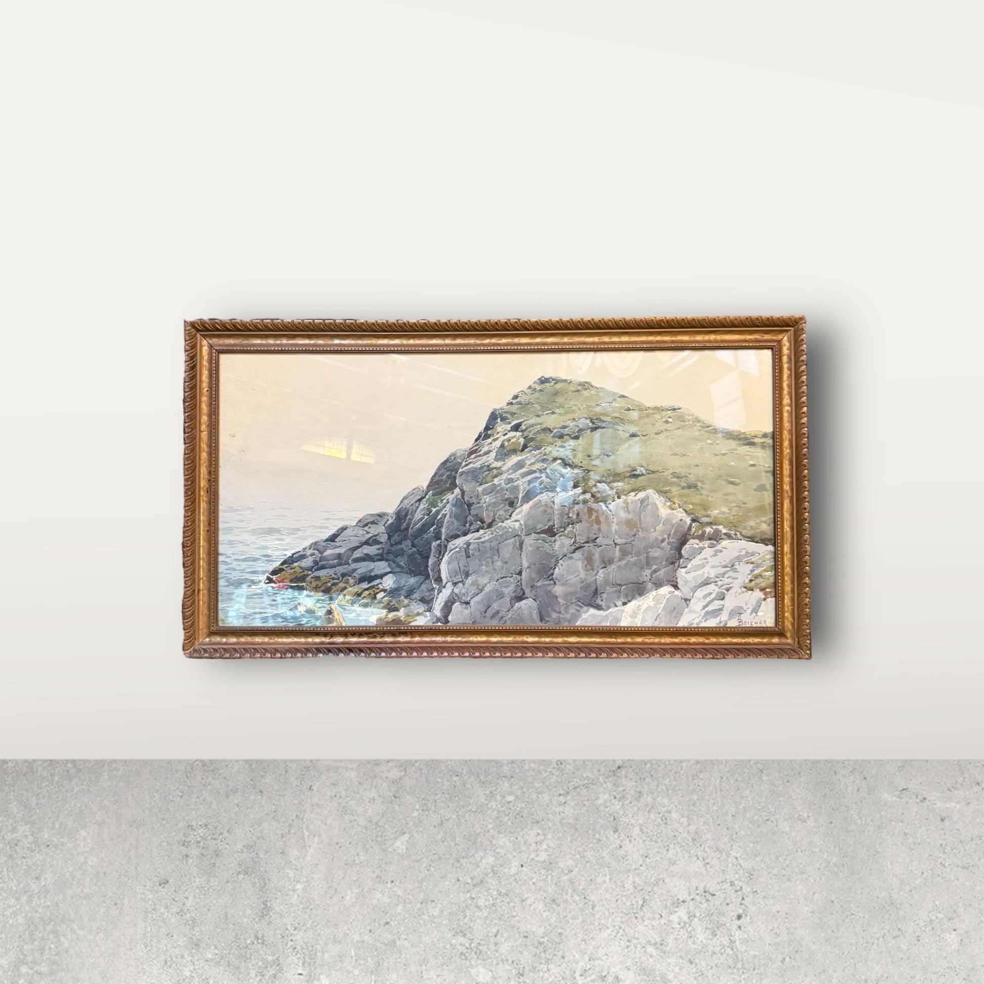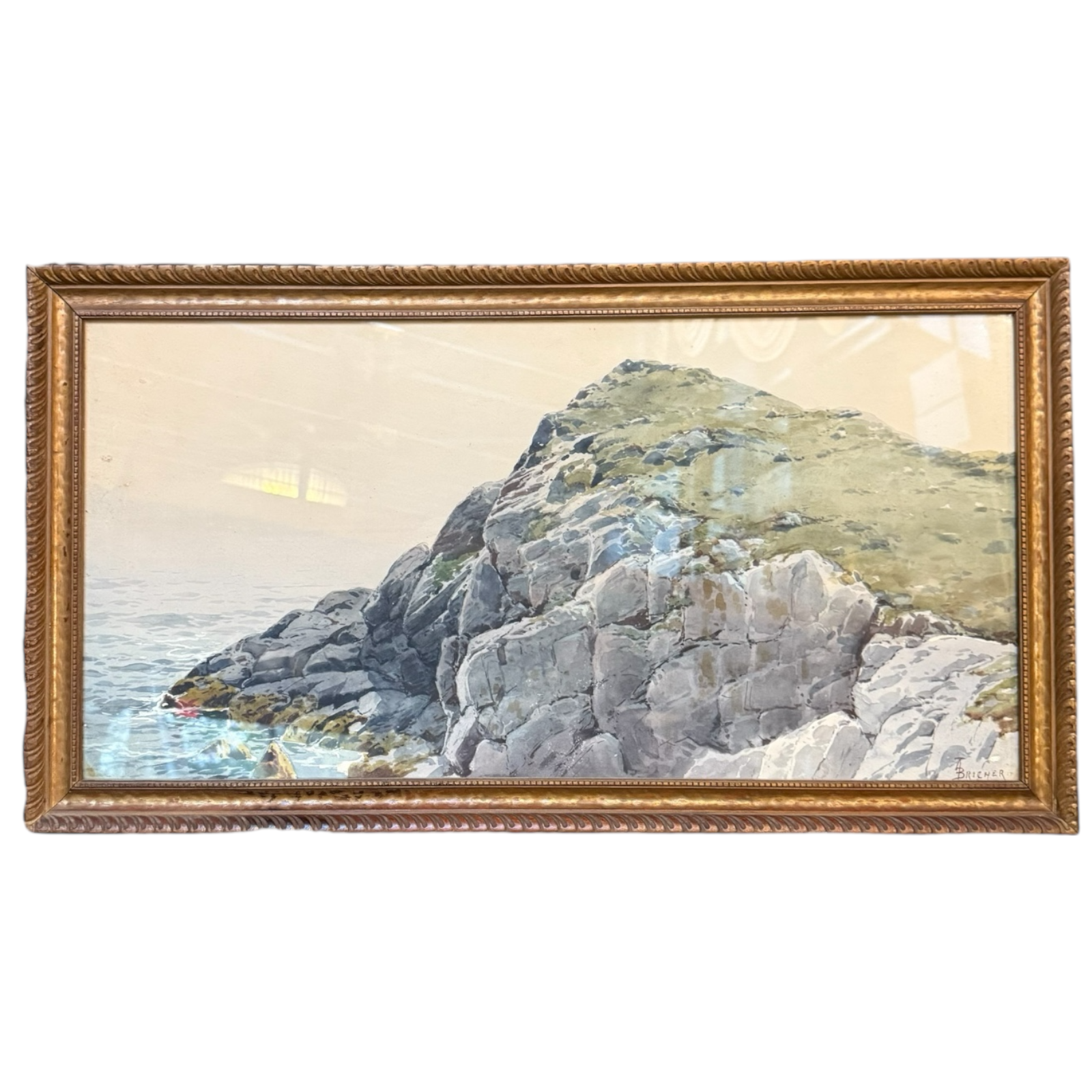 This finely rendered oil on board captures a dramatic, rocky lakeside outcrop bathed in soft atmospheric light. Bricher’s expert use of detail and muted tonality imbues the scene with a serene yet majestic stillness that exemplifies his signature Luminist style.
