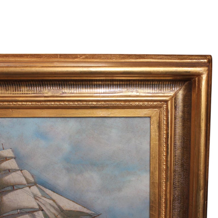 This stunning maritime oil painting by renowned marine artist Antonio Jacobsen (1850–1921) captures a majestic American clipper ship gracefully cutting through the ocean under full sail. Executed in 1917 and signed in the lower right corner, the piece exhibits Jacobsen’s characteristic precision in rendering ship rigging, motion, and atmosphere. The American flag flying proudly at the stern emphasizes its heritage.