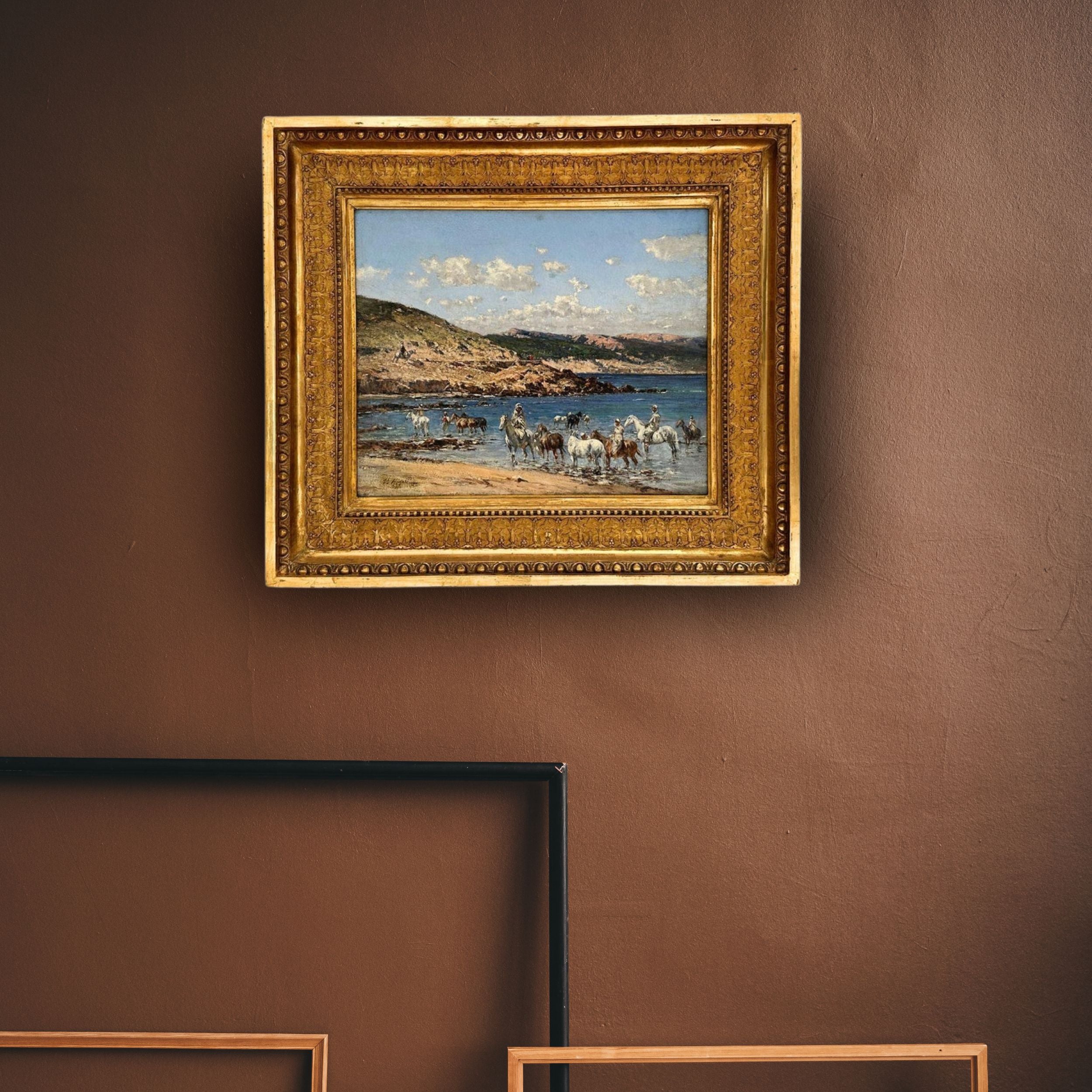 With an expert command of light and movement, Victor Huguet’s At the Shore transports the viewer to a coastal expanse where a group of Arab horsemen and figures gather against a stunning backdrop of rolling hills and shimmering waters. The artist’s masterful brushwork captures the interplay of the elements—the salty breeze ruffling garments, the rhythmic motion of waves against the shore, and the powerful presence of the Arabian horses, poised and alert. Rich blues, ochres, and sunlit highlights infuse the scene with vitality, while the fluidity of Huguet’s technique evokes a dynamic interplay between humanity and nature.