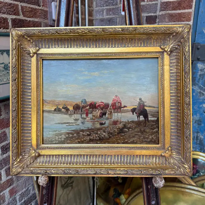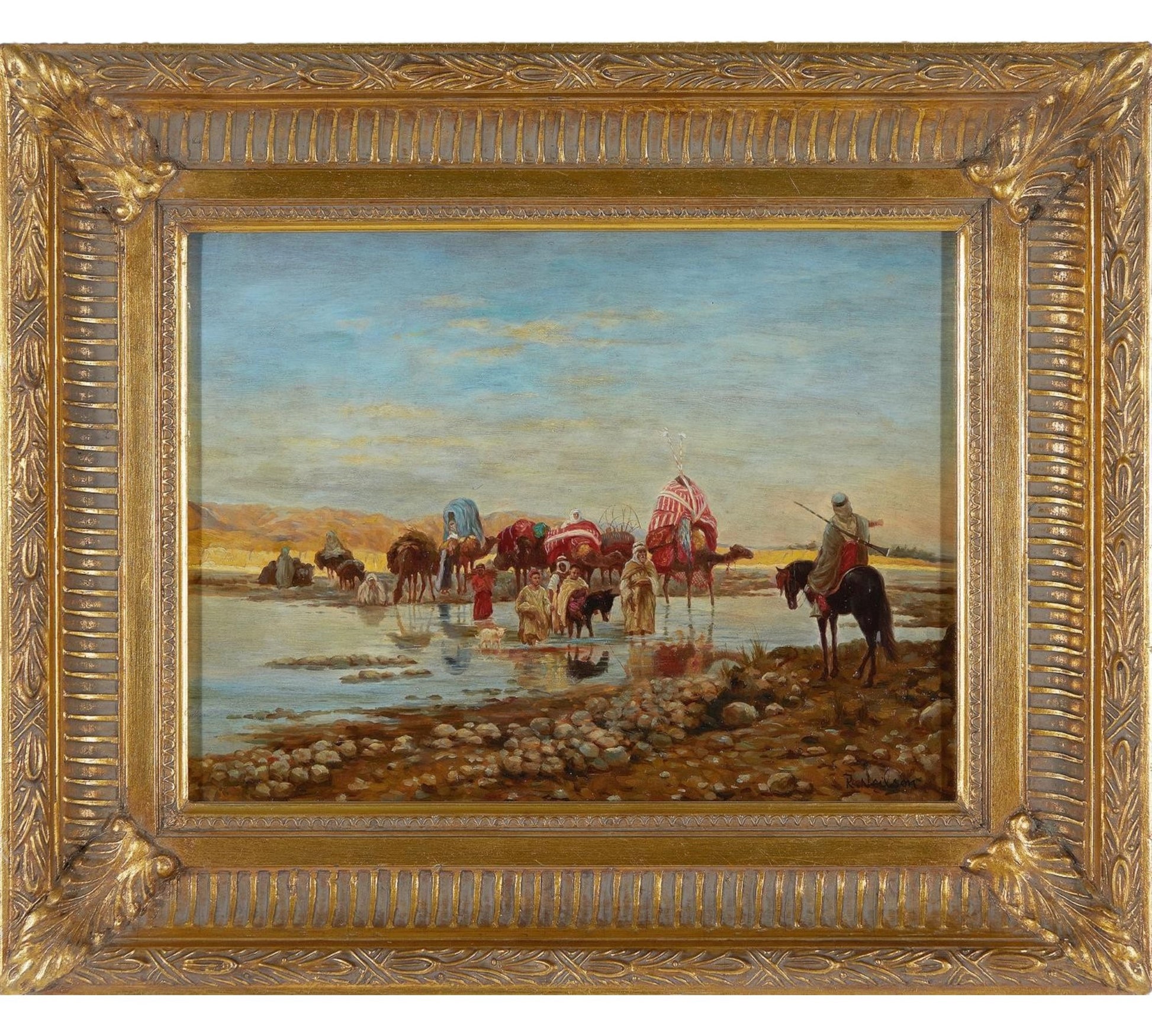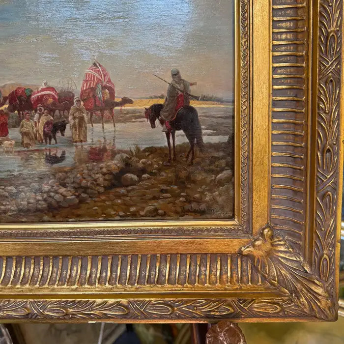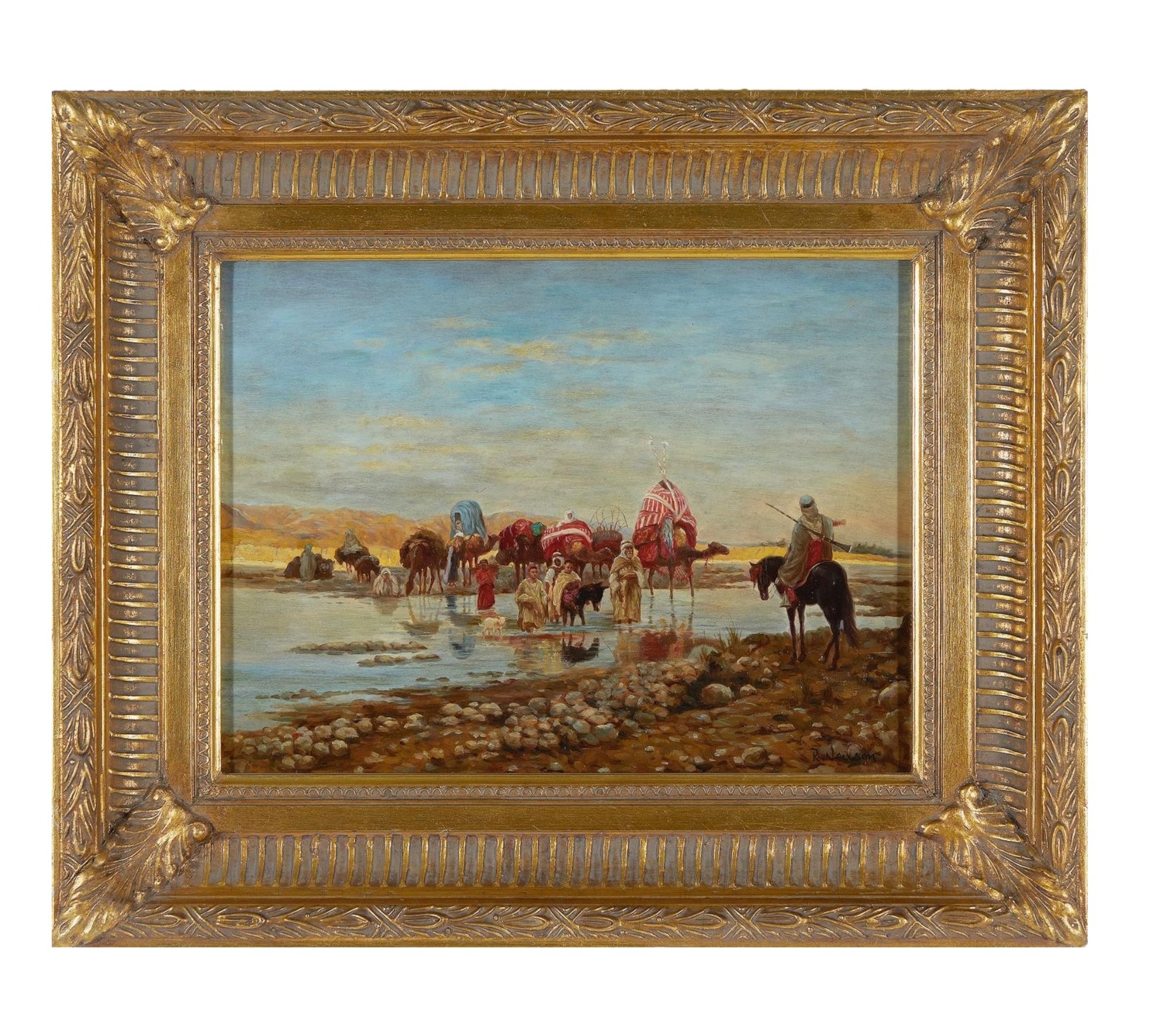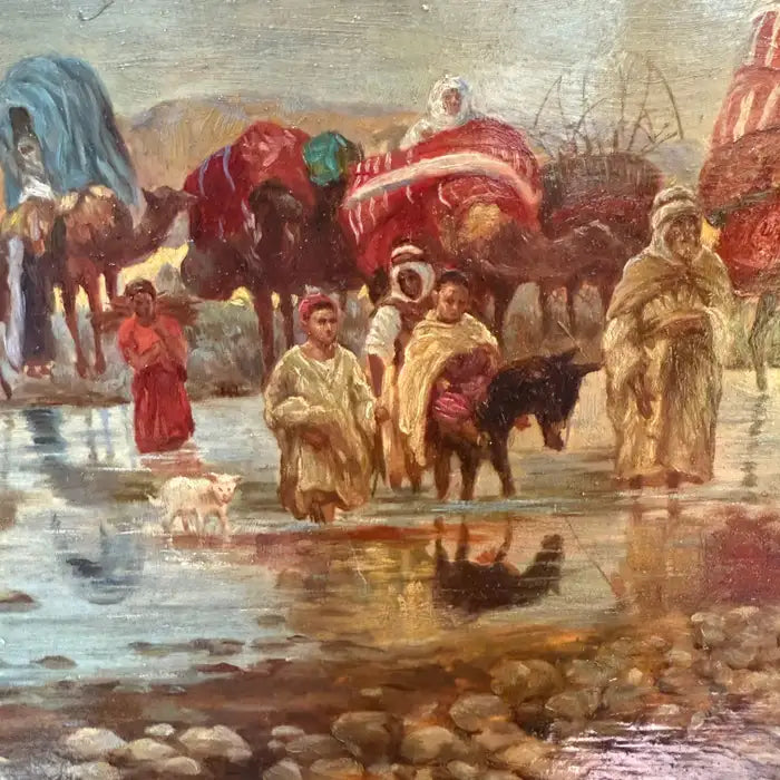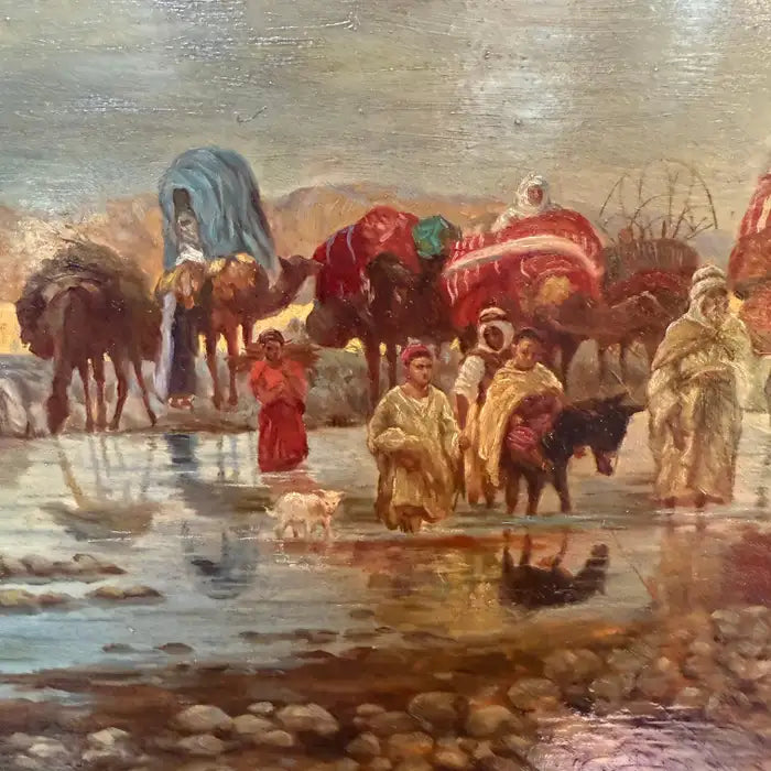 - Caravan Crossing a Ford – Orientalist Oil Painting by R. Neilson. Circa 1930