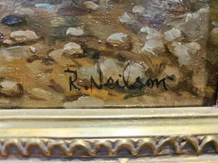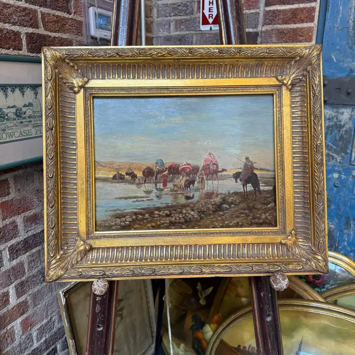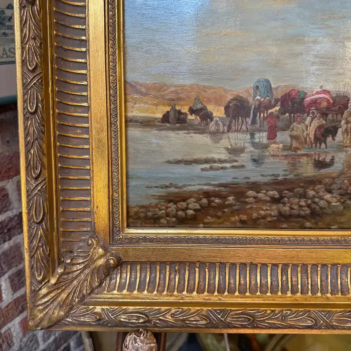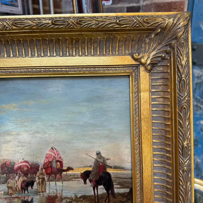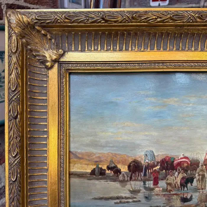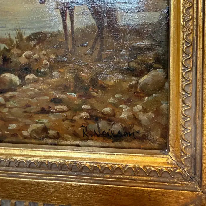 "Caravan Crossing a Ford" – Orientalist Oil Painting by R. Neilson (after Girardet) Medium: Oil on panel Dimensions (unframed): 12 in x 16 in (30.5 x 40.6 cm) Framed Size: 23 in X 19 in Signature: Signed lower right “R. Neilson” Condition: Excellent condition, minor signs of age. Giltwood frame in very good shape. A stunning Orientalist painting signed by R. Neilson, echoing the influence of Eugène-Alexis Girardet. This evocative composition captures a richly adorned caravan pausing to cross a shallow ford, with camels draped in red textiles and figures in traditional North African or Middle Eastern attire. The stillness of the water, fine reflections, and vibrant palette add movement and atmosphere to the scene. The piece is set in an antique carved gilt frame that enhances its classic presence. A refined work for collectors of 19th-century or Orientalist art.