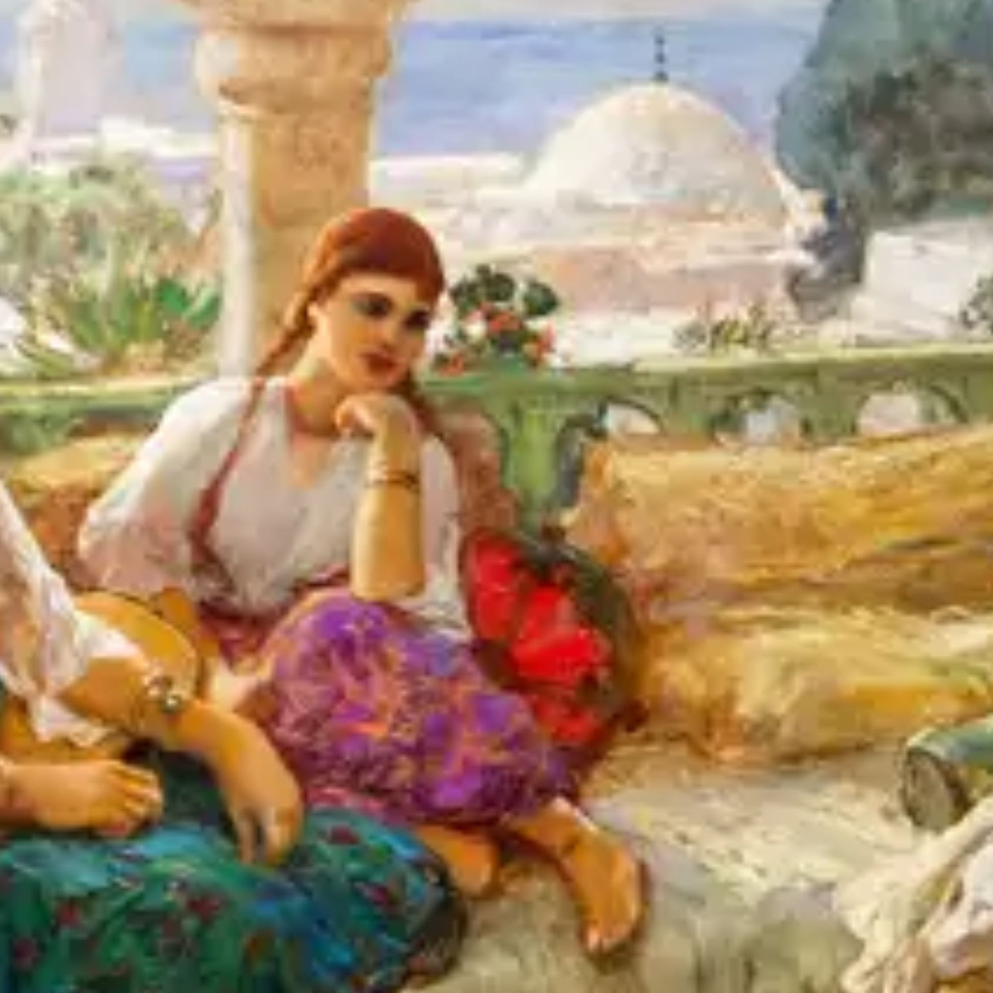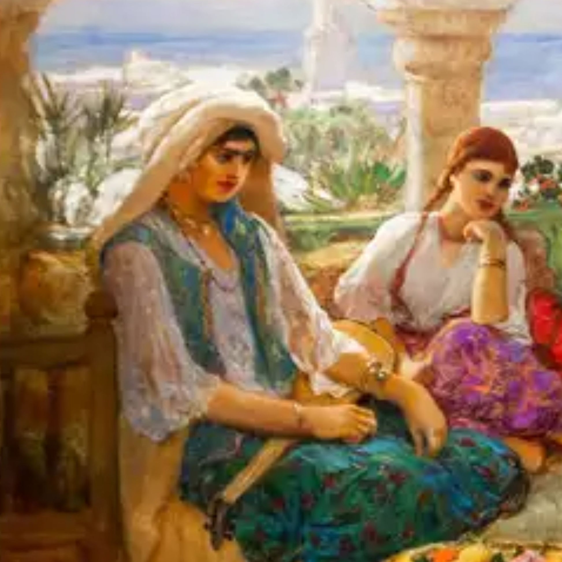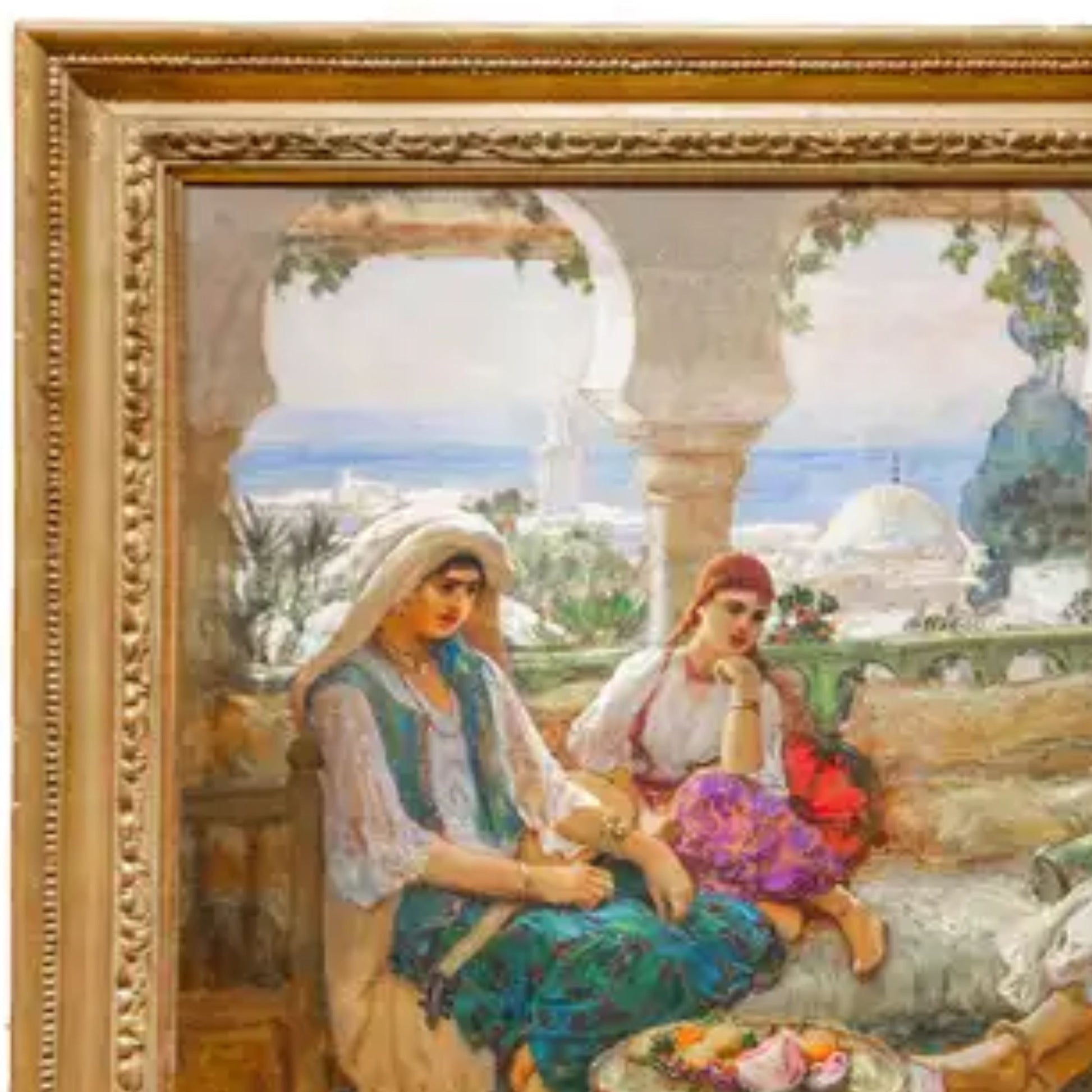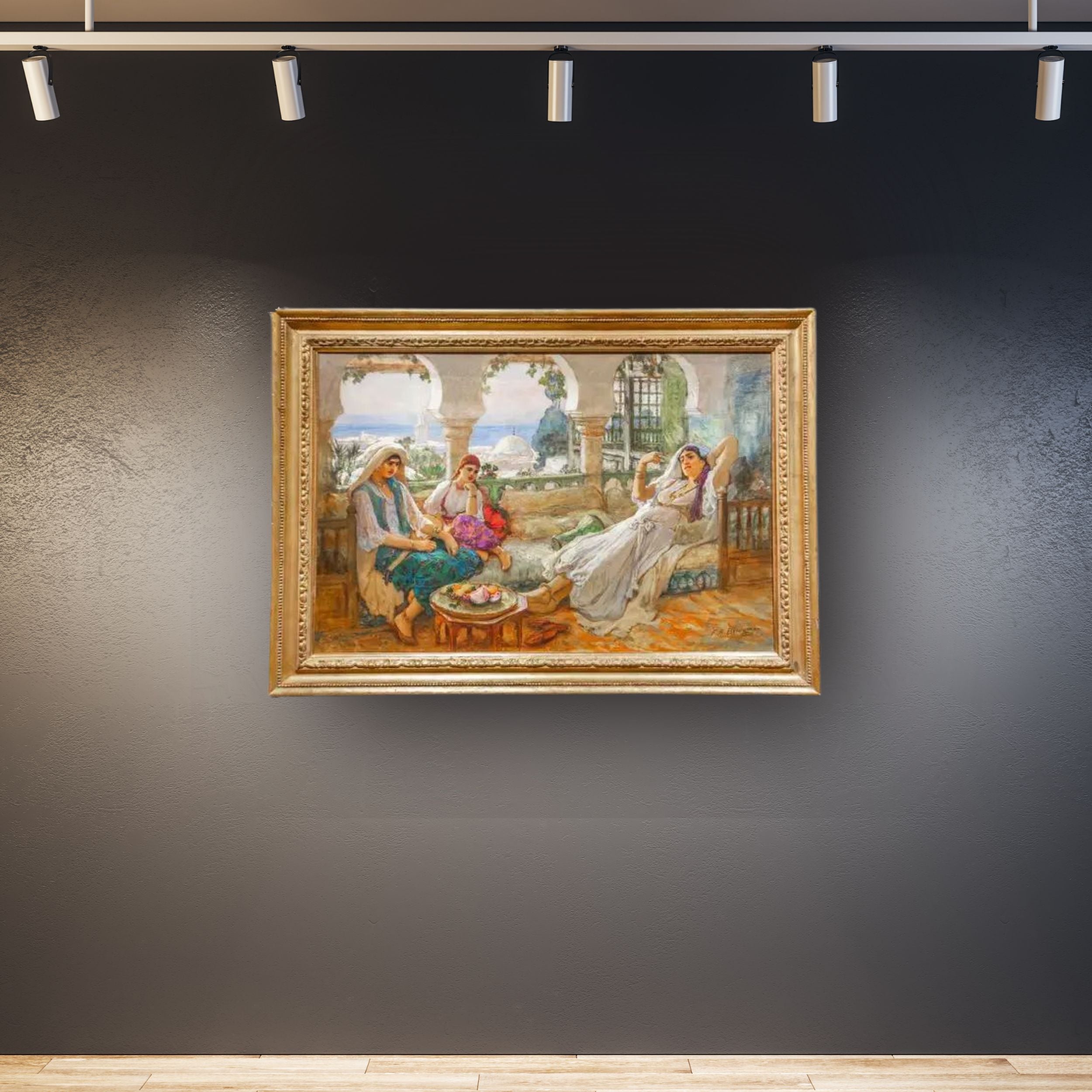 Frederic Arthur Bridgman's painting On the Terrace offers an intimate glimpse into the private world of North African women. The composition features three women lounging on a sunlit terrace, adorned in vibrant, multi-hued fabrics and richly bejeweled with gold and silver bangles on their wrists and ankles. They recline comfortably in a light-filled interior, with the bright white-walled buildings of the city and the sparkling blue sea visible through the arcade, creating a serene and inviting atmosphere.