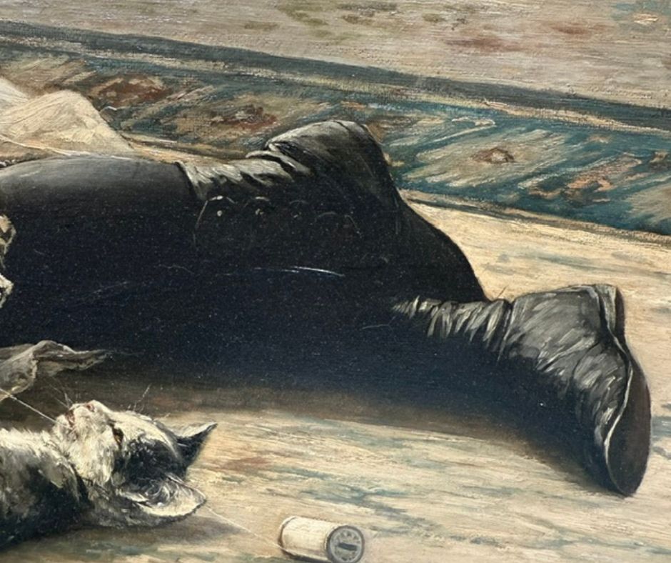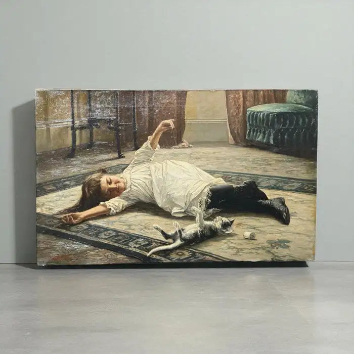 A heartwarming and finely detailed oil painting by German-American artist Robert Koehler (1850–1917). This genre scene captures a tender domestic moment: a young girl lies playfully on a patterned carpet, her hand outstretched toward a frisky kitten. The sunlight streaming into the room and the lush textures of the rug, dress, and velvet armchair in the background highlight Koehler’s technical skill and storytelling.