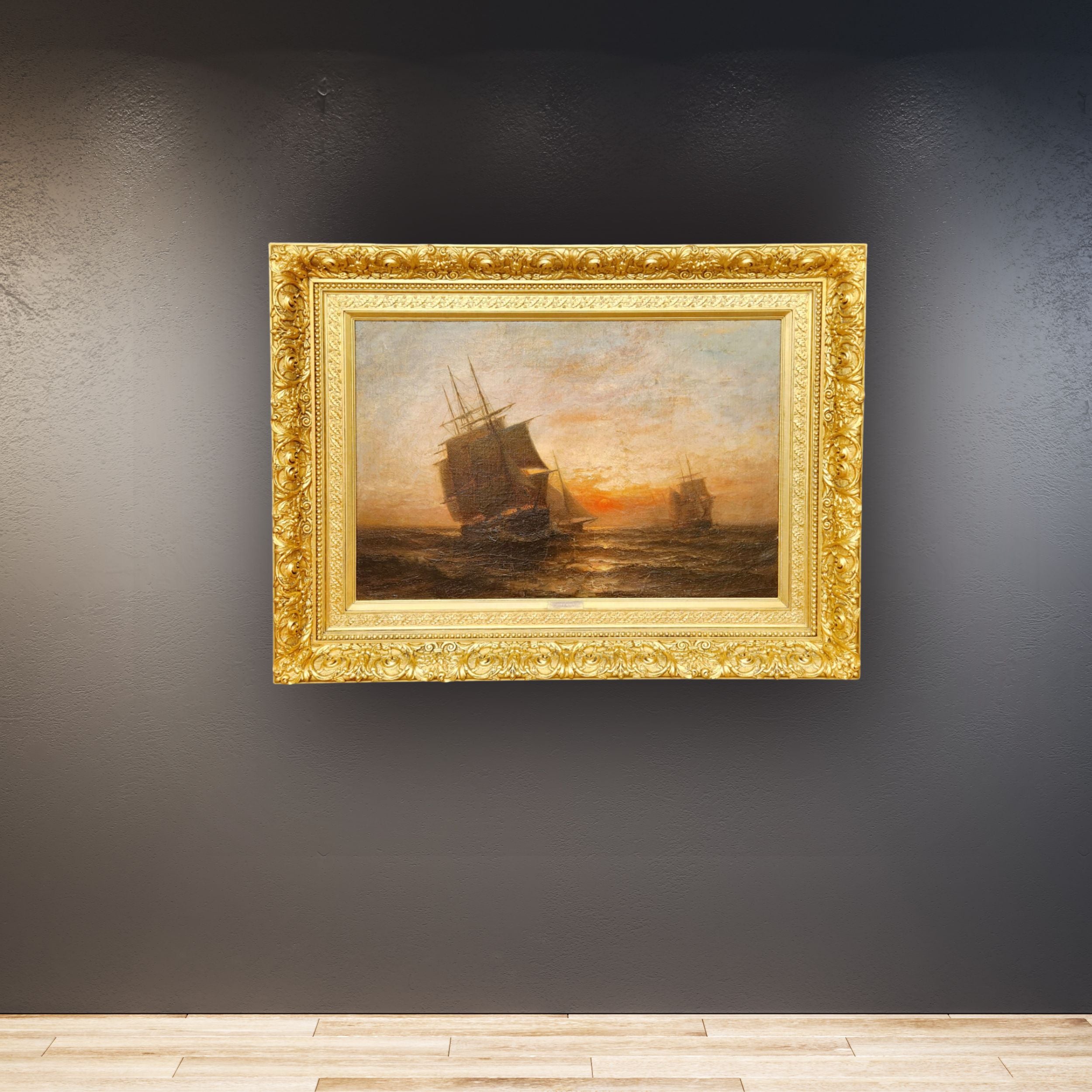 Weber’s Ships at Sunset is a testament to the Luminist tradition, a movement that sought to capture the sublime beauty of natural light and its effects on land and water. His careful rendering of atmospheric conditions and his keen eye for realism align him with the American maritime painters of the late 19th century. The piece not only showcases his technical mastery but also his ability to evoke emotion through composition and color. As a work that encapsulates the romanticism of the sea, it holds an important place within the maritime art tradition, preserving the timeless allure of seafaring life.