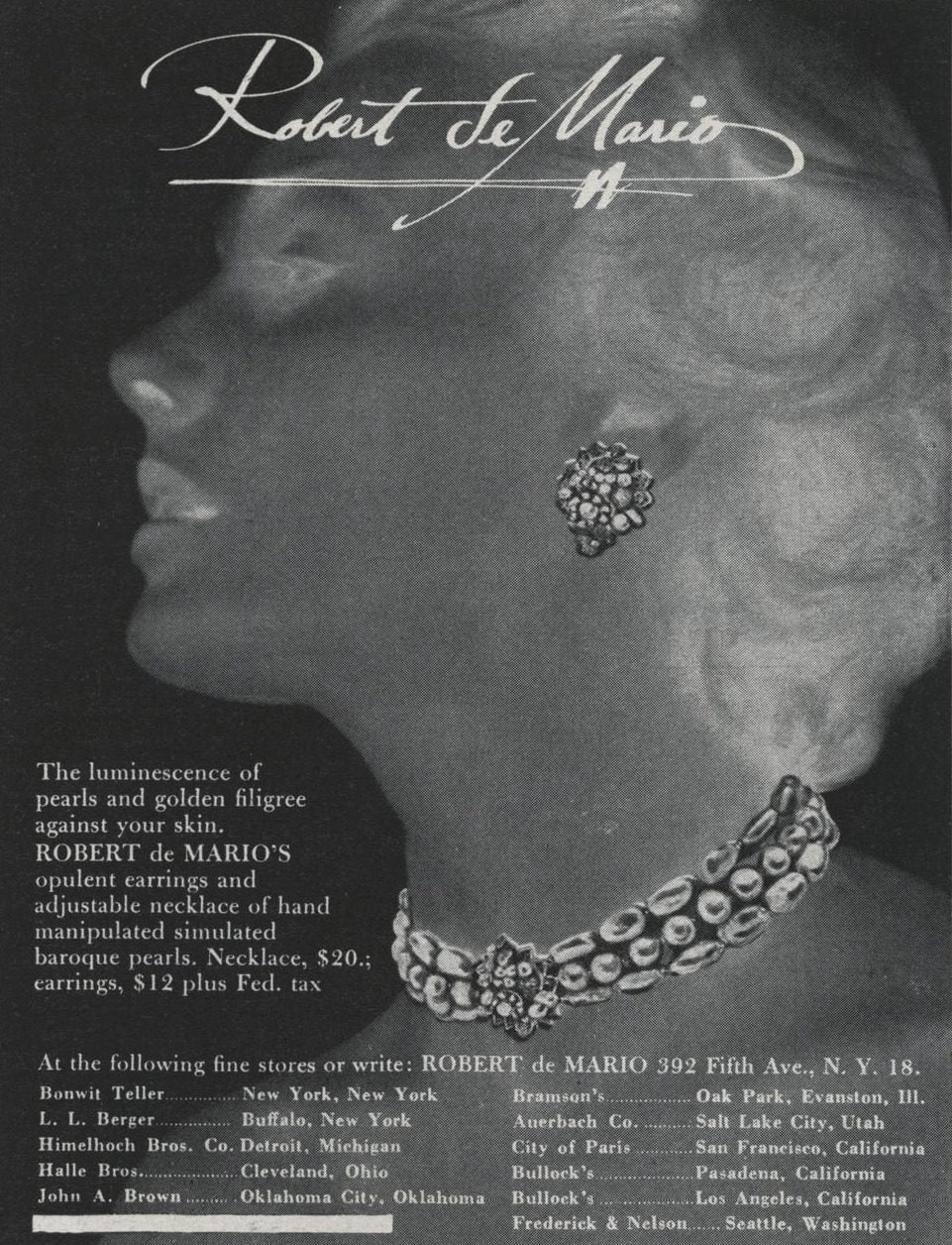 Founded in the late 1940s, Robert DeMario’s jewelry was known for its elaborate, handcrafted designs featuring layered metalwork, cascading rhinestones, and intricate beading. Drawing inspiration from Baroque Revival and Victorian aesthetics, DeMario’s short-lived but highly sought-after creations became staples of high-end costume jewelry in the 1950s. This piece captures DeMario’s signature romantic opulence and rare artistry.