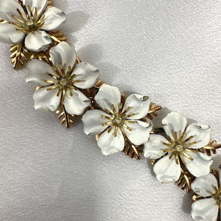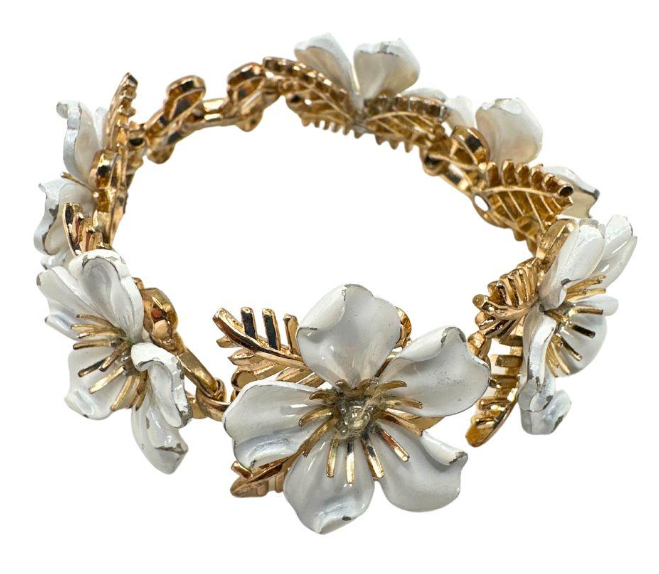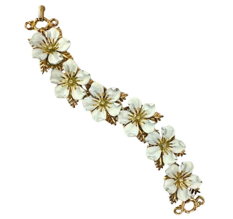 Indulge in the nostalgia of vintage fashion with our Signed Trifari Dogwood Vintage Enamel White and Gold Flower Bracelet. Let the elegance of the dogwood flowers bloom on your wrist, adding a touch of sophistication and a nod to classic beauty to your overall ensemble.