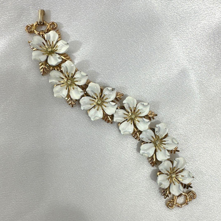 Crafted with meticulous attention to detail, this vintage bracelet features delicate enamel dogwood flowers in a beautiful white and gold color combination. The intricate floral design exudes charm and grace, adding a touch of femininity to your ensemble.